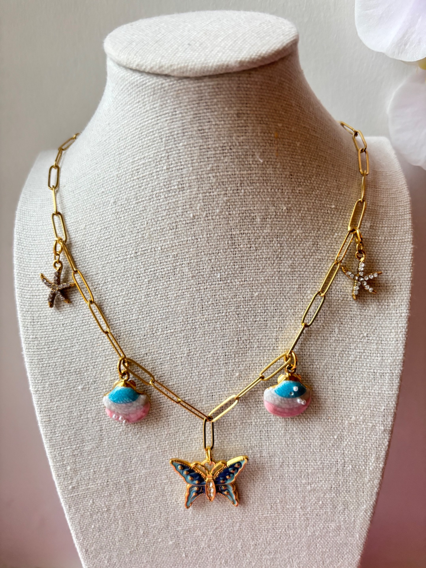 Tämä kullattu koru on kuin postikortti unelmiesi rannalta. Keskellä loistaa suuri, syvänsininen perhonen – vapauden ja keveyden symboli. Sitä ympäröivät hennon pinkin ja sinisen sävyiset simpukat sekä kimaltavat meritähdet, jotka tuovat mieleen auringon heijastukset kirkkaalla vedenpinnalla. Herkkä ja siro ketju viimeistelee korun keijumaisen ilmeen. Täydellinen valinta merisielulle, joka kantaa mukanaan kesän taikaa ja meren rauhaa.