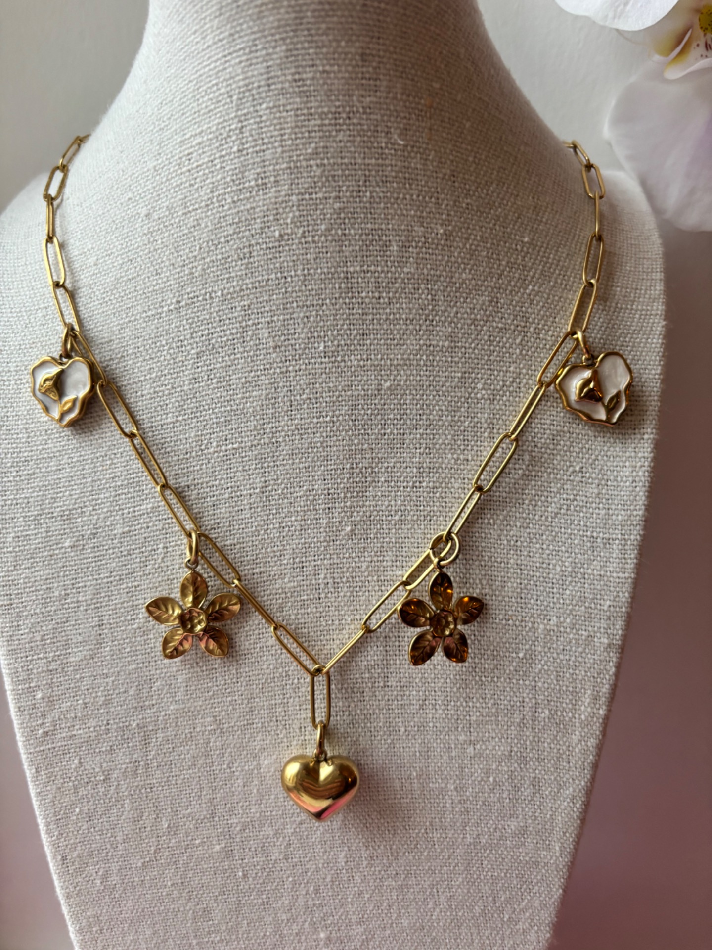 Tämä kaunis, kullattu koru hurmaa herkkyydellään ja yksityiskohdillaan. Keskellä sädehtii sydän – rakkauden ajaton symboli – jota reunustavat sirot kukat ja pienet sydämet, kuin kevyt kuiskaus kesästä. Kapea ja hienostunut ketju viimeistelee korun siron ilmeen. Täydellinen lahja rakkaudelle, ystävälle tai itselle muistutukseksi kauneudesta, joka puhkeaa kukkaan sydämestä.