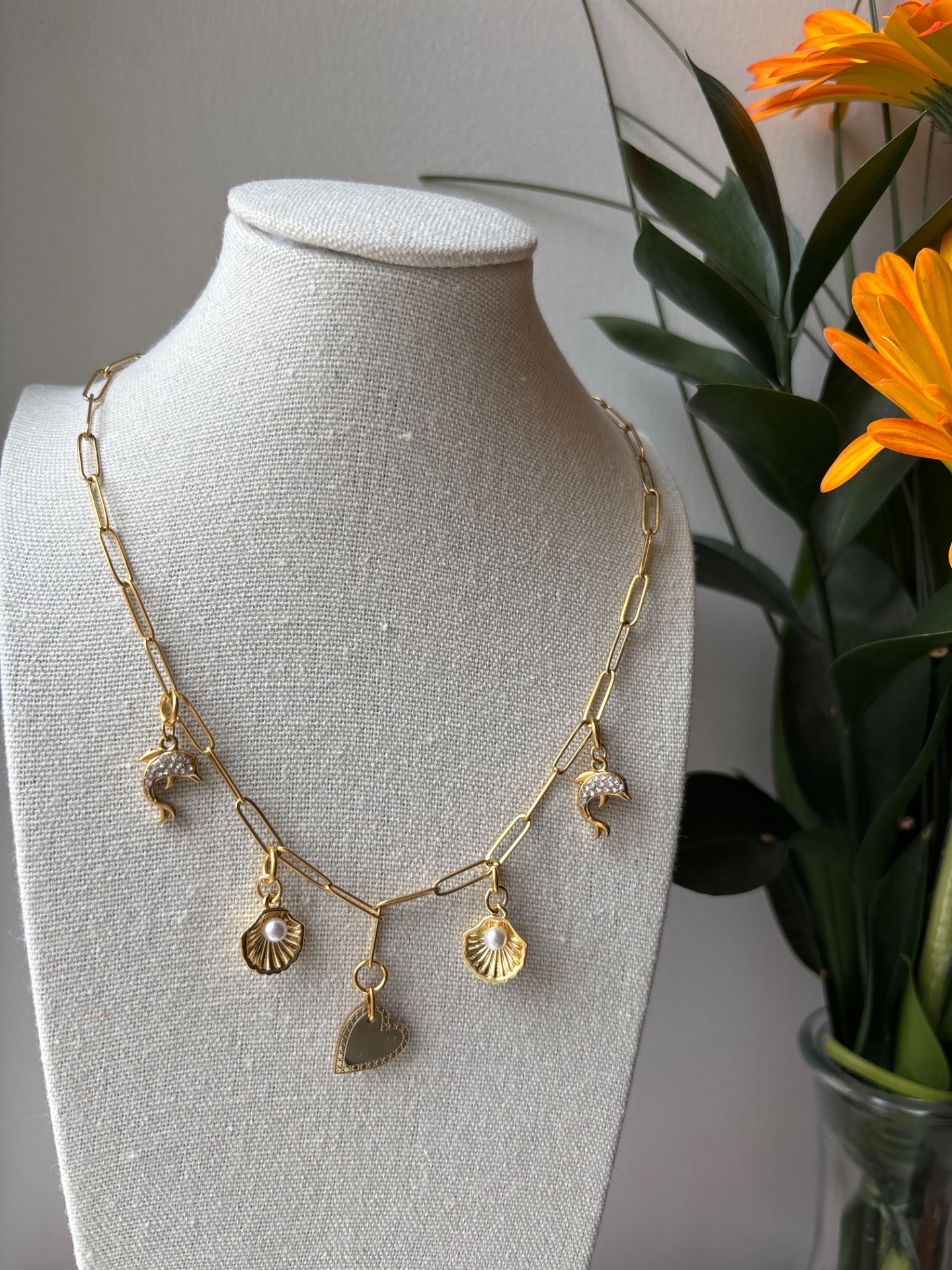 Elegantti ja hempeä kultainen paperclip-kaulakoru, jota koristavat suloiset heloina riippuvat delfiinit, simpukat ja sydän. Koru yhdistää meren kauneuden ja romanttisen symboliikan – täydellinen lahjaksi tai omaksi aarteeksi arkeen ja juhlaan. Ketjun pituus 44cm.