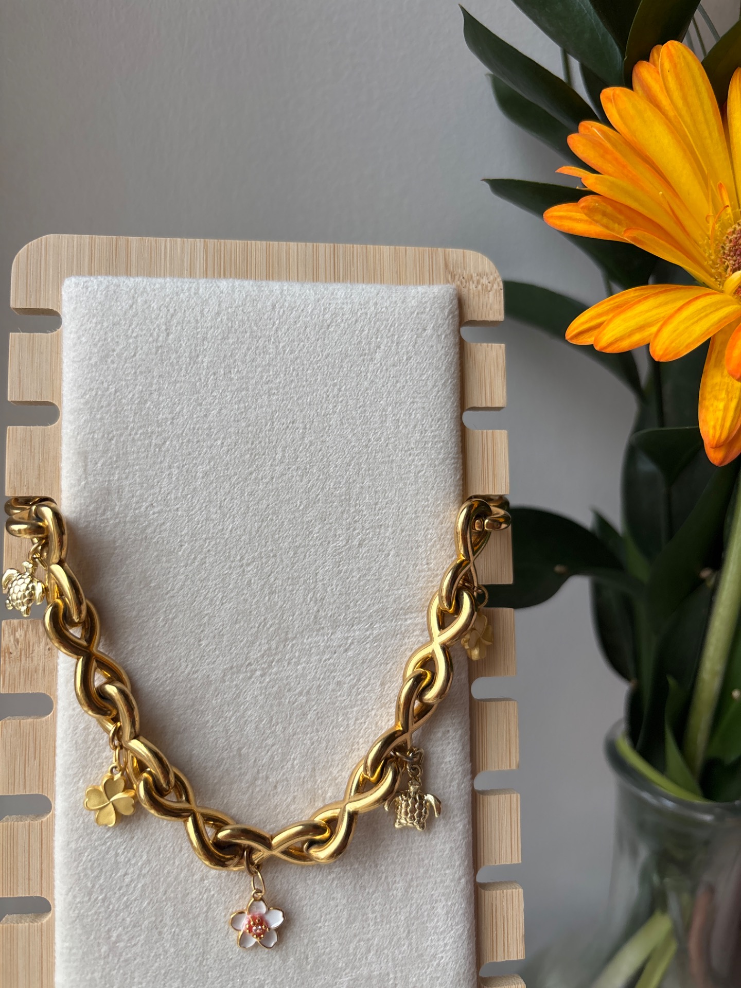 Luonnon kauneus ranteessasi. Kultainen koru, jossa on neliapiloita, kilpikonnia ja värikäs kukka – onnea, rauhaa ja elämänvoimaa yhdessä korussa. Korun pituus 22cm, mahdollisuus lyhentää - manitsethan tästä tilausvaiheessa kohdassa lisätiedot.
