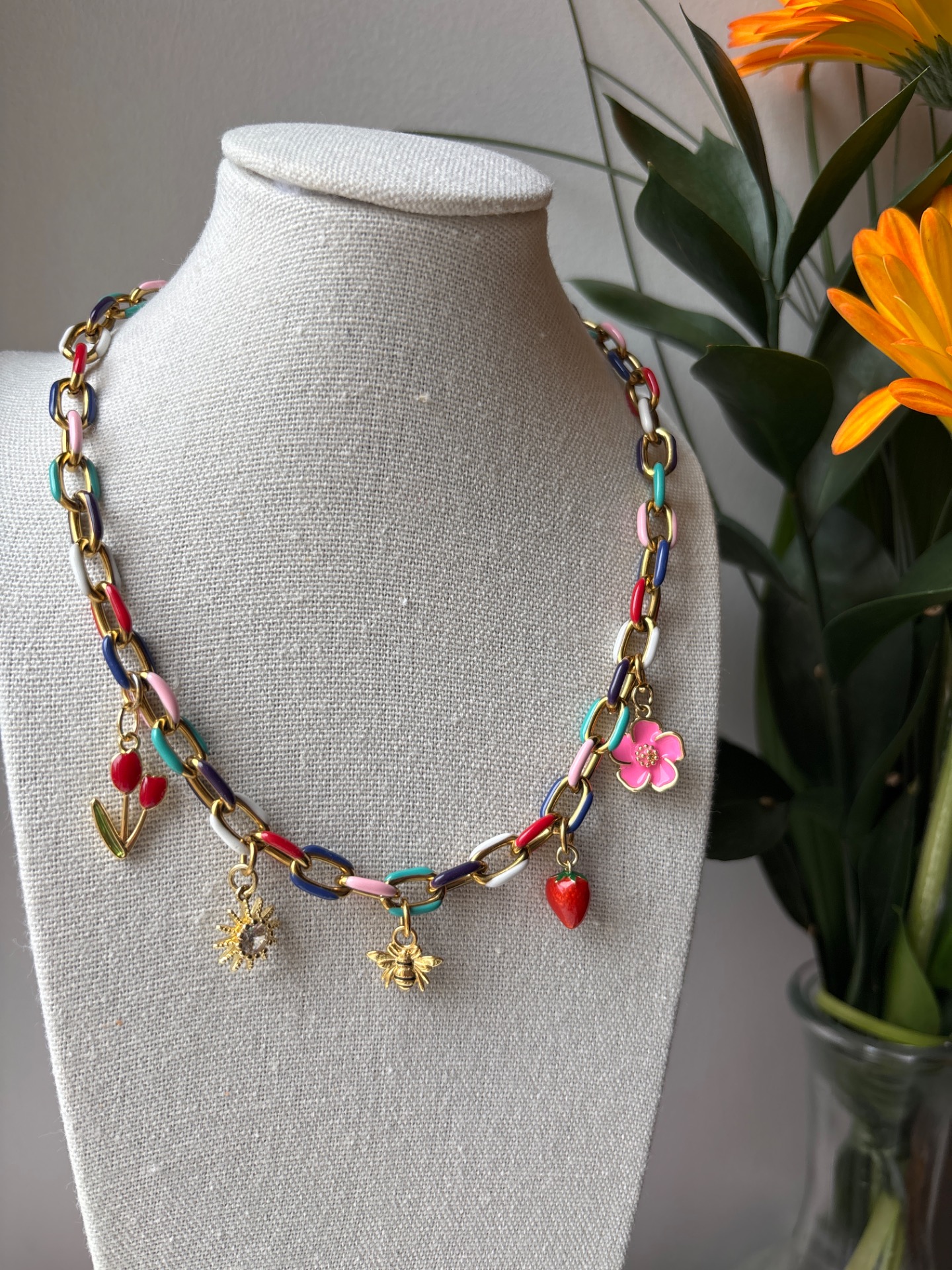 Suhiseva Garden -kaulakoru on kuin pieni kesäpuutarha kaulallasi. Värikkäästä ketjusta roikkuvat ampiainen, kukat, mansikka ja aurinko luovat iloisen ja elinvoimaisen kokonaisuuden, joka huokuu lämpöä ja luonnon kauneutta. Tämä koru sopii täydellisesti tuomaan piristystä arkeen tai kruunaamaan rennon tyylin. Ketjun pituus 40cm.